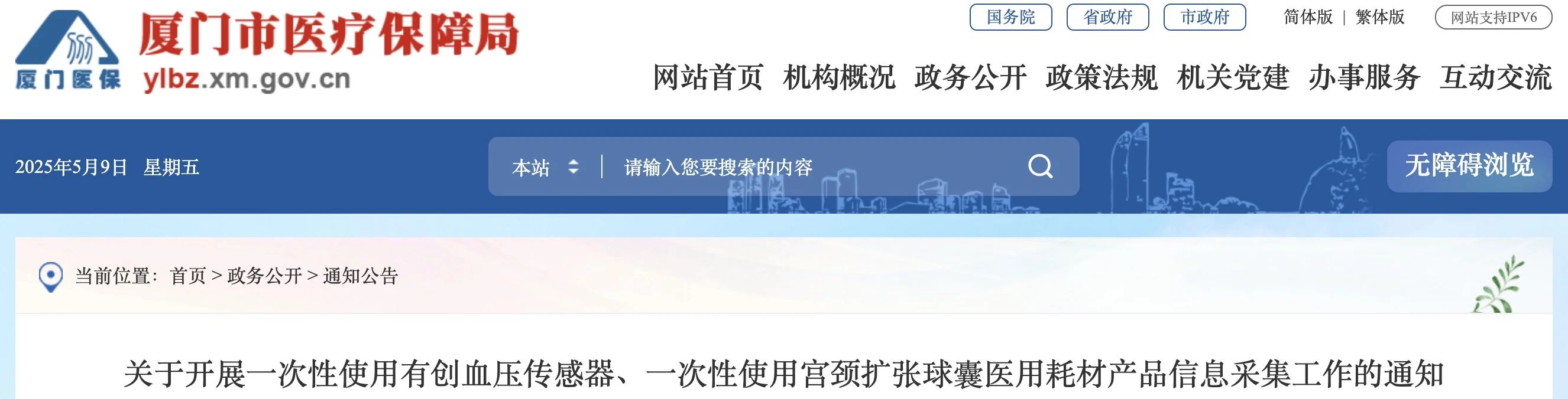 今日(5月9日),福建省廈門市醫保局發布《關于開展一次性使用有創血壓傳感器、一次性使用宮頸擴張球囊醫用耗材產品信息采集工作的通知》,信息維護時間為2025年5月12日08:00至5月20日17:00。