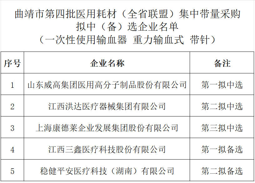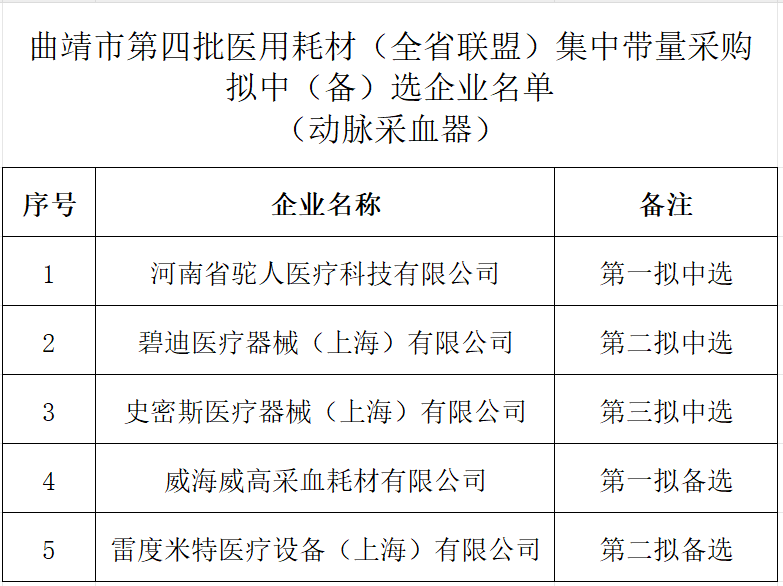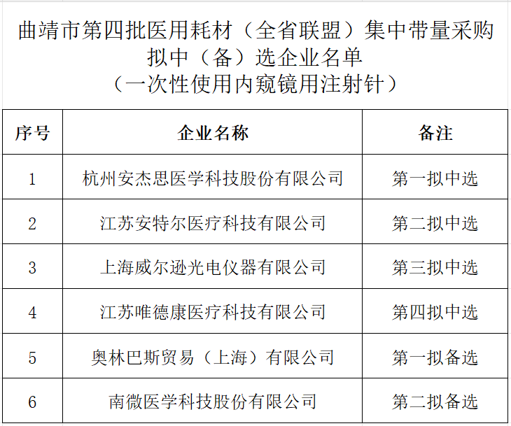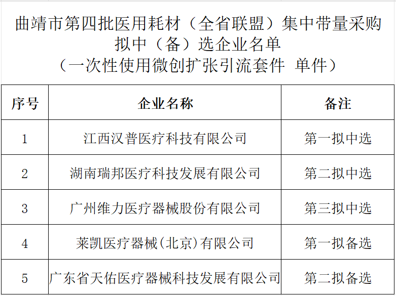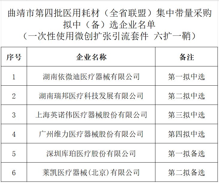 4月1日,云南曲靖市藥品和醫用耗材聯合采購辦公室發布《曲靖市第四批醫用耗材(全省聯盟) 集中帶量采購擬中(備)選企業公示》。
