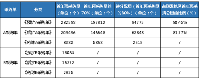 其中待分配量是:聯盟地區預擴/后擴/藥球A采購單中同一注冊證首年合計預采購量的30%+預擴/后擴/藥球A采購單第一輪未中選注冊證對應首年預采購量的70%+B類采購單預擴/后擴/藥球聯盟地區首年預采購量。