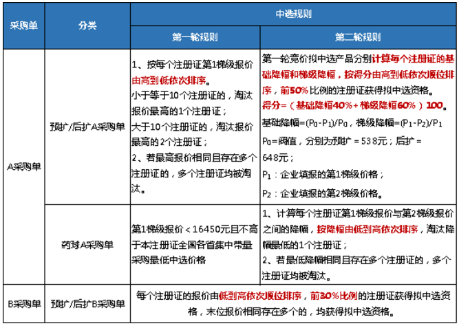 第二輪,根據基礎降幅與梯級降幅權重4:6進行計算得分,按照分值高低確定中選,并獲得待分配量。