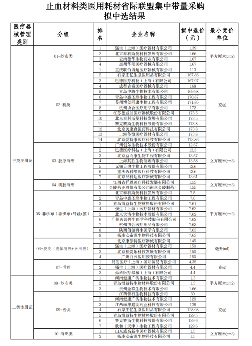 11月24日,內蒙古醫保局發布《關于止血材料類醫用耗材省際聯盟集中帶量采購擬中選結果的公示》。
