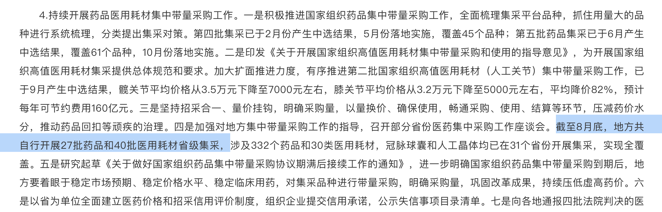 此外,國家醫(yī)保局加強(qiáng)對(duì)地方集中帶量采購工作的指導(dǎo)。截至8月底,地方共自行開展27批藥品和40批醫(yī)用耗材省級(jí)集采,涉及332個(gè)藥品和30類醫(yī)用耗材。其中,冠脈球囊和人工晶體均已在31個(gè)省份開展集采,實(shí)現(xiàn)全覆蓋。