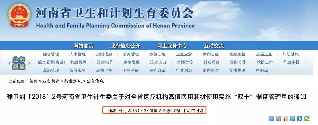 大概三周前,賽柏藍器械曾撰文報道關于開封市衛計委實施高值耗材“雙十制度”,開封市發布的文件名為《關于對全市醫療機構高值醫用耗材使用實施“雙十”制度管理的通知》,其中明確要求,各醫療機構均要建立完善高值醫用耗材使用“雙十”制度,要成立高值醫用耗材管理專委會,確保“雙十”制度貫徹落實。