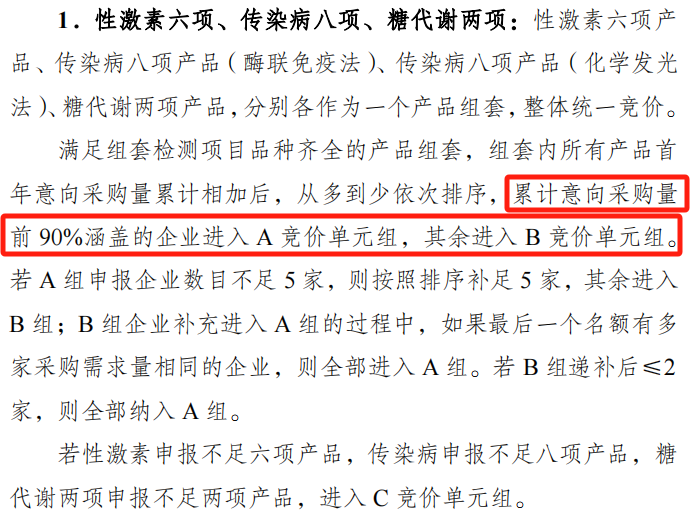 根據公告,本次聯盟集采將單檢測項目或組套檢測項目品種齊全項目按醫療機構意向采購量分為 A、B 兩個競價單元,性激素六項、傳染病八項、糖代謝兩項三類產品分別按組套采購。