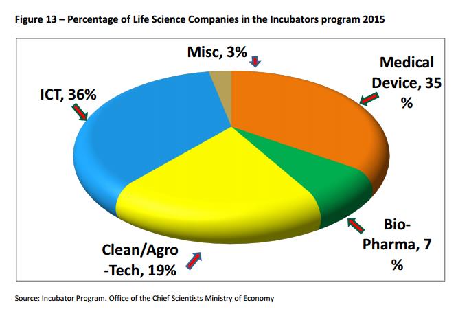 以色列政府政策上的巨大扶持和幫助對(duì)醫(yī)療器械技術(shù)起了極其重要的作用。從干預(yù)政策、政府資助、貸款及擔(dān)保項(xiàng)目到稅收優(yōu)惠等。以色列于2011年頒布了“天使法”(angel law),鼓勵(lì)早期的投資行為。符合資格的投資者,如果投資于本土的高科技企業(yè),就能減免相應(yīng)額度的稅款。同時(shí)針對(duì)符合相應(yīng)要求的高科技公司,政府將資助1/2的研發(fā)經(jīng)費(fèi),而針對(duì)創(chuàng)業(yè)公司,政府將資助2/3的經(jīng)費(fèi)。此外,以色列政府成立了數(shù)十家孵化器,對(duì)創(chuàng)業(yè)公司可提供85%的研發(fā)費(fèi)用。孵化器每年新增70~80個(gè)創(chuàng)業(yè)公司,過(guò)去十年(2005~2014),有696家公司進(jìn)入了孵化器項(xiàng)目,其中有231家(33.2%)是醫(yī)療器械公司,97家(14%)是生物/制藥公司。通過(guò)下圖我們看到,2015年,孵化期內(nèi)35%的創(chuàng)業(yè)公司都是醫(yī)療器械相關(guān)。
