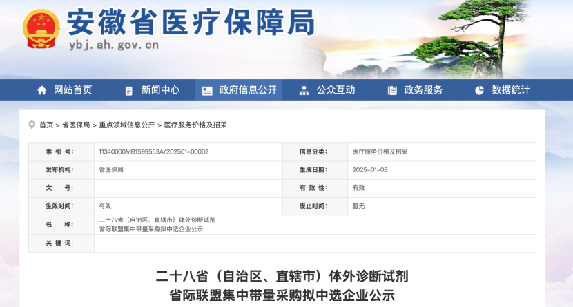 1月3日,安徽醫(yī)保局發(fā)布《二十八省(自治區(qū)、直轄市)體外診斷試劑省際聯(lián)盟集中帶量采購擬中選企業(yè)公示》,于2025年1月3日至1月7日對二十八省(自治區(qū)、直轄市)體外診斷試劑聯(lián)盟集采擬中選結(jié)果進行公示。