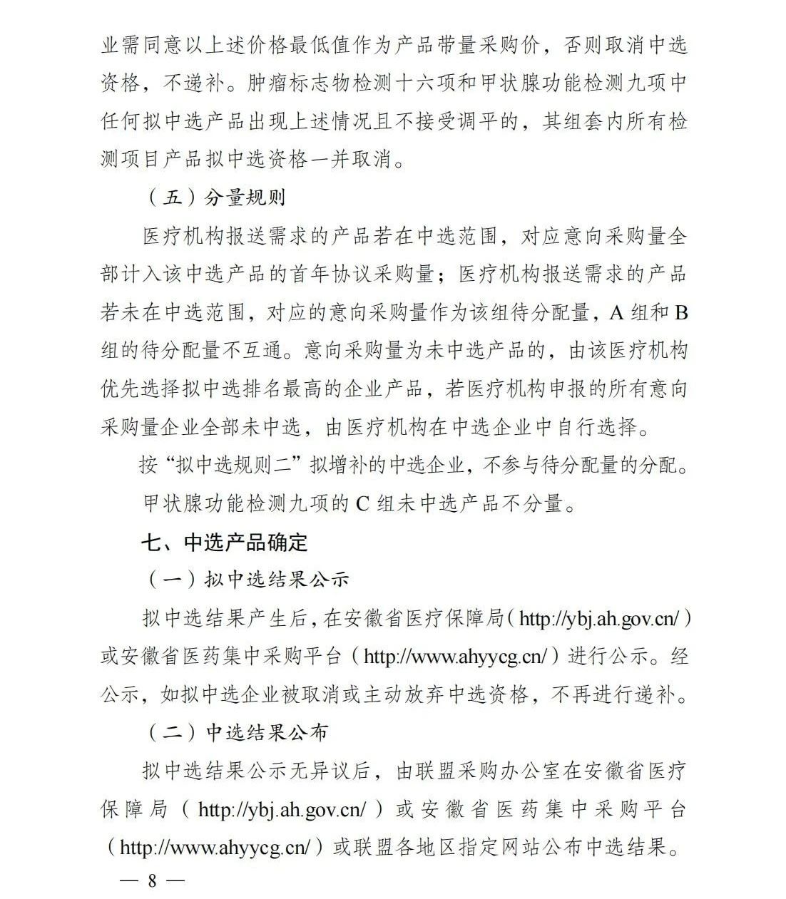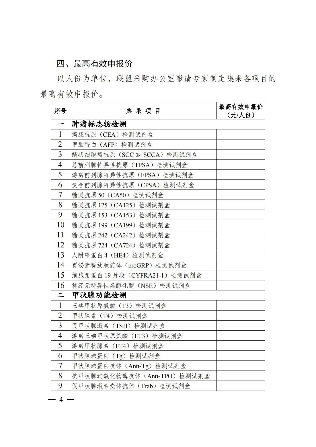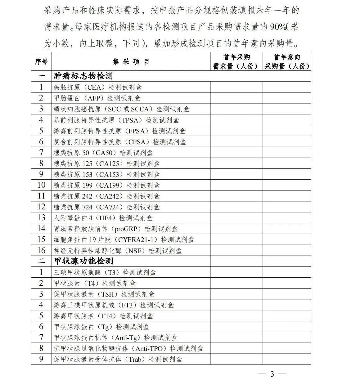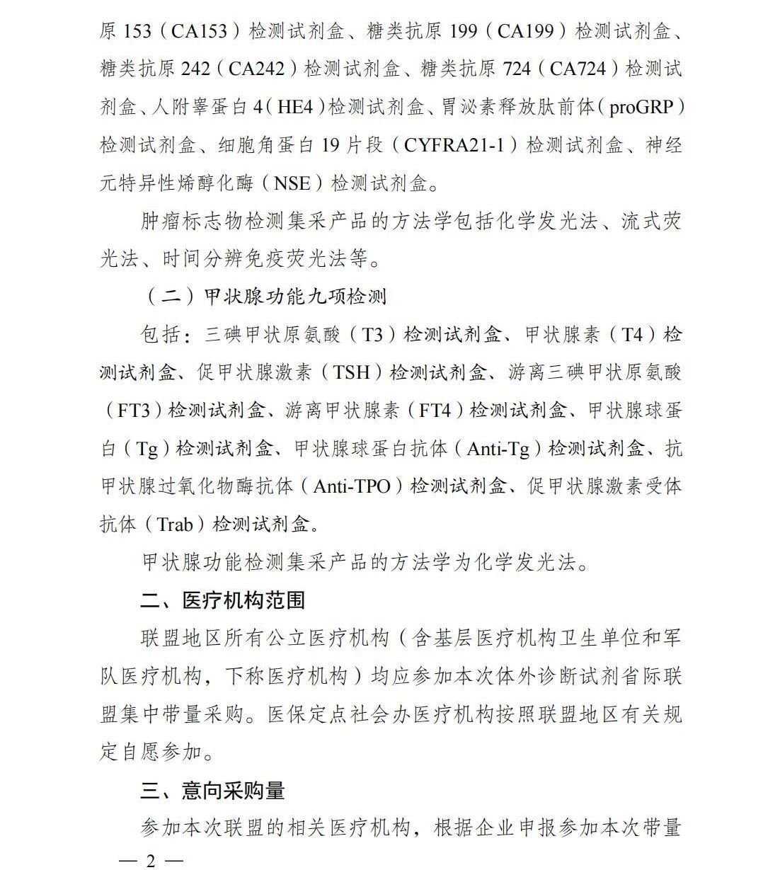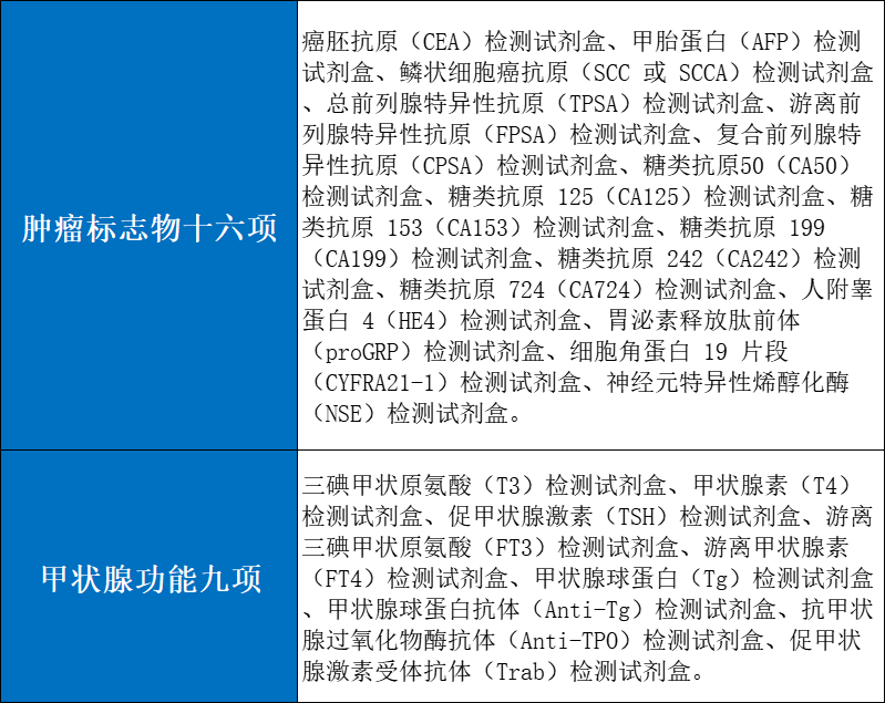 此次集采周期兩年,采購品種包括腫瘤標(biāo)志物檢測產(chǎn)品十六項(化學(xué)發(fā)光法、流式熒光法、時間分辨免疫熒光法等)與甲狀腺功能檢測產(chǎn)品九項(化學(xué)發(fā)光法),具體如下: