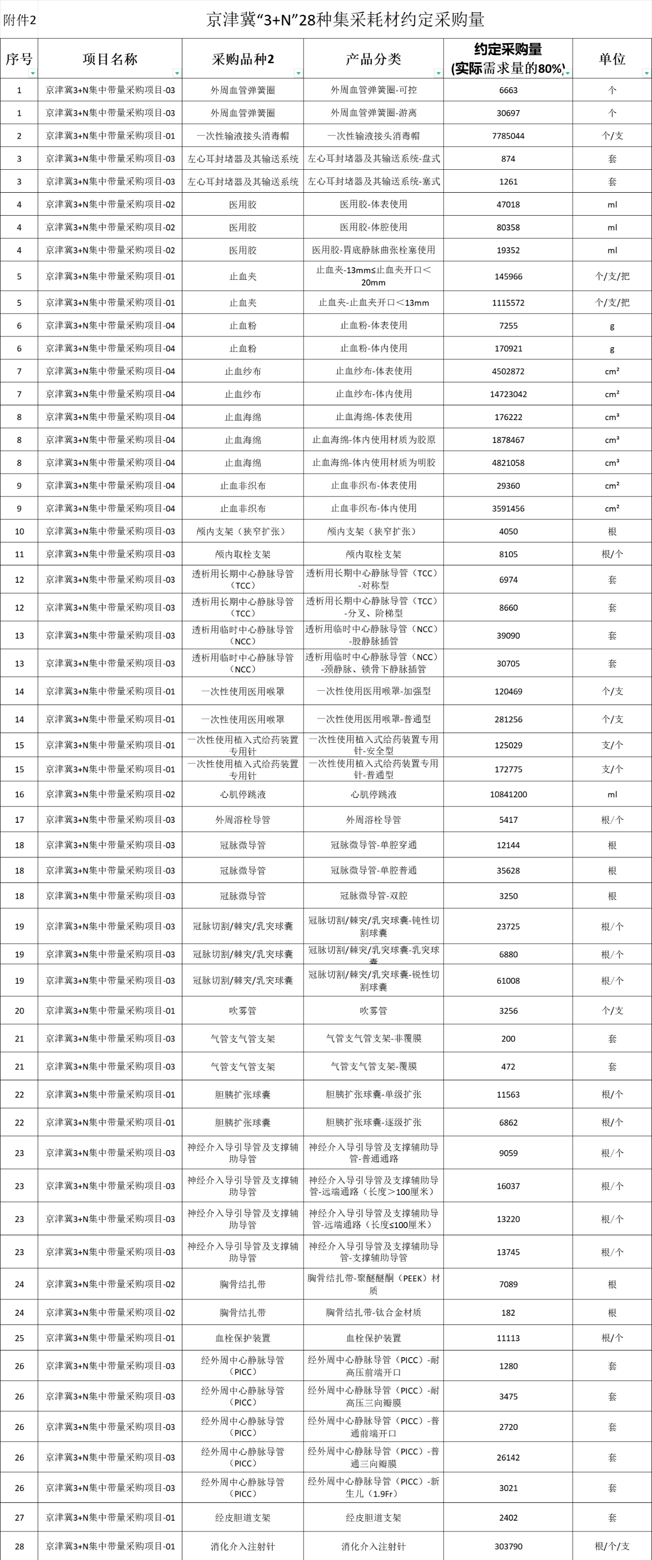 1月23日,河北省醫用藥品器械集中采購中心發布《關于公布京津冀“3+N”聯盟28種醫用耗材集中帶量采購產品報名結果、約定采購量、分組情況及關聯關系的通知》、《關于開展京津冀“3+N”聯盟28種集中帶量采購醫用耗材報價工作的通知》。