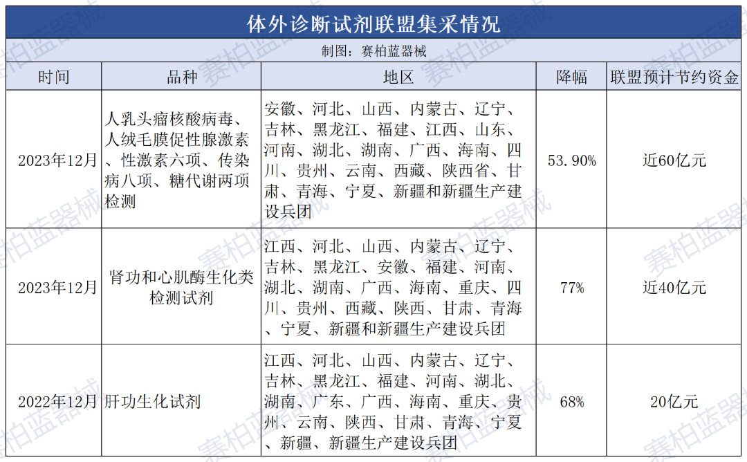 根據官方披露的數據,覆蓋23省的肝功生化類集采平均降幅68.64%;覆蓋24省的腎功和心肌酶生化類檢測試劑集采平均降幅約77%;覆蓋25省的安徽2023年體外診斷試劑聯盟平均降幅約53.9%。