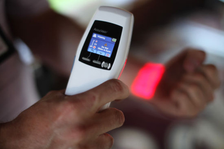 據(jù)介紹,這種外觀比電視遙控器大不了多少的便攜式、非接觸靜脈定位儀,可以幫助護(hù)士在進(jìn)行靜脈穿刺時(shí)準(zhǔn)確找到靜脈的位置。其工作方式是首先使用紅外光檢測(cè)到皮膚之下的靜脈,然后在皮膚表面用光照標(biāo)明靜脈的位置。