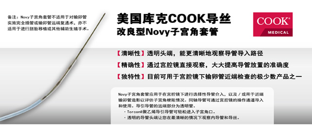 美國庫克COOK導絲應用于在宮腔鏡下進行選擇性導管導入,以及/或用于近端輸卵管造影以評估子宮角梗阻情況。操作簡單,安全有效,創傷小、無傷疤、痛苦小、術后恢復快、住院時間短、并發癥少。