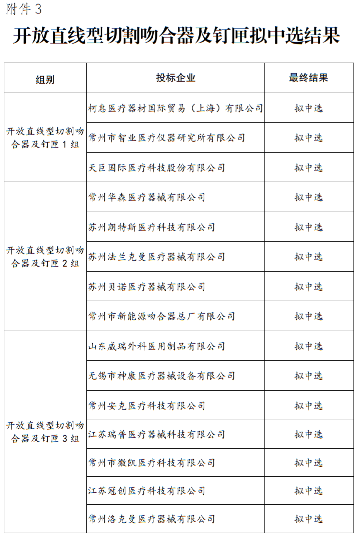 開放直線型切割吻合器及釘匣擬中選械企包括柯惠醫療、常州華森、蘇州朗特斯等;