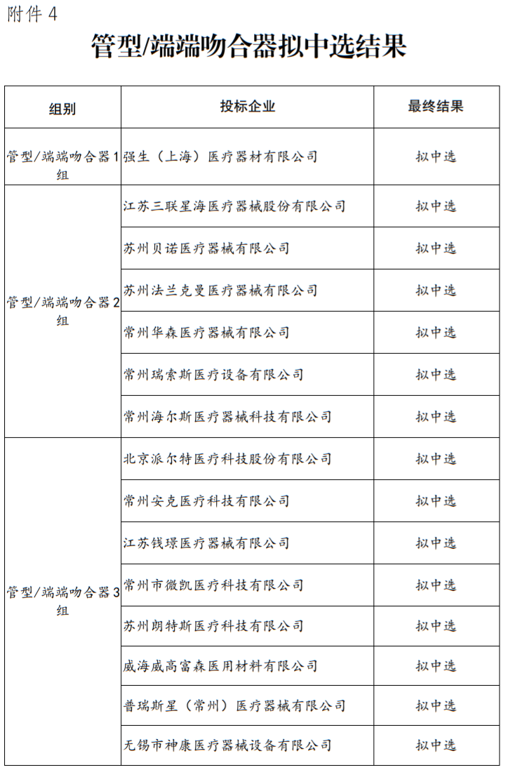 管型/端端吻合器擬中選械企包括強生、江蘇三聯星海、威海威高富森、北京派爾特等;