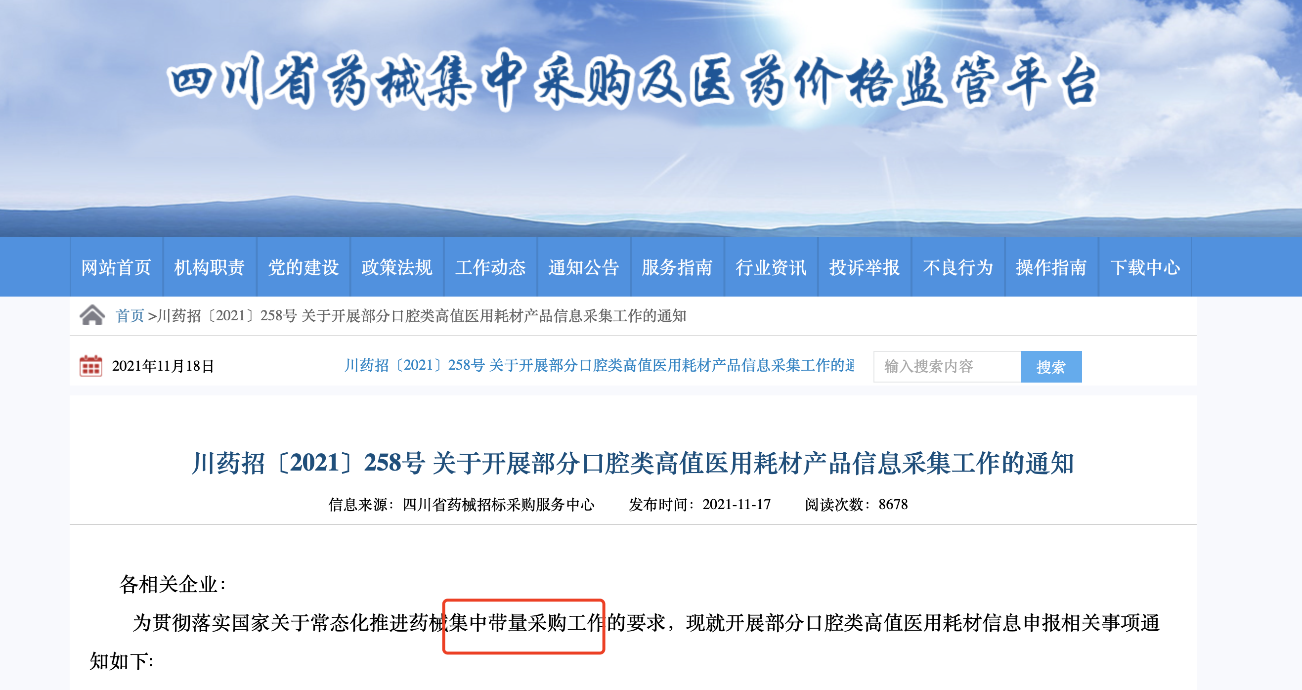 今日(11月18日),四川省藥械招標采購服務中心正式開啟了維護口腔種植體、修復基臺醫(yī)用耗材產(chǎn)品的信息申報工作,申報截止時間至2021年11月23日。