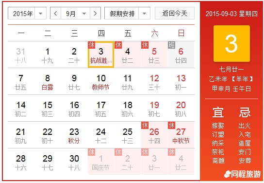 2015年北京華康普美科技有限公司,“抗戰(zhàn)勝利”假期為:9月3日(星期四)至9月5日(星期六)共放3天,9月6日(星期日)正常上班。