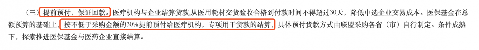 在回款上,醫療機構與企業結算貨款,從醫用耗材交貨驗收合格到付款時間不得超過30天,降低中選企業交易成本。醫?;鹪诳傤~預算的基礎上,按不低于采購金額的30%提前預付給醫療機構,專項用于貨款的結算,具體預付貨款方式由聯盟采購各省(市)自行制定。