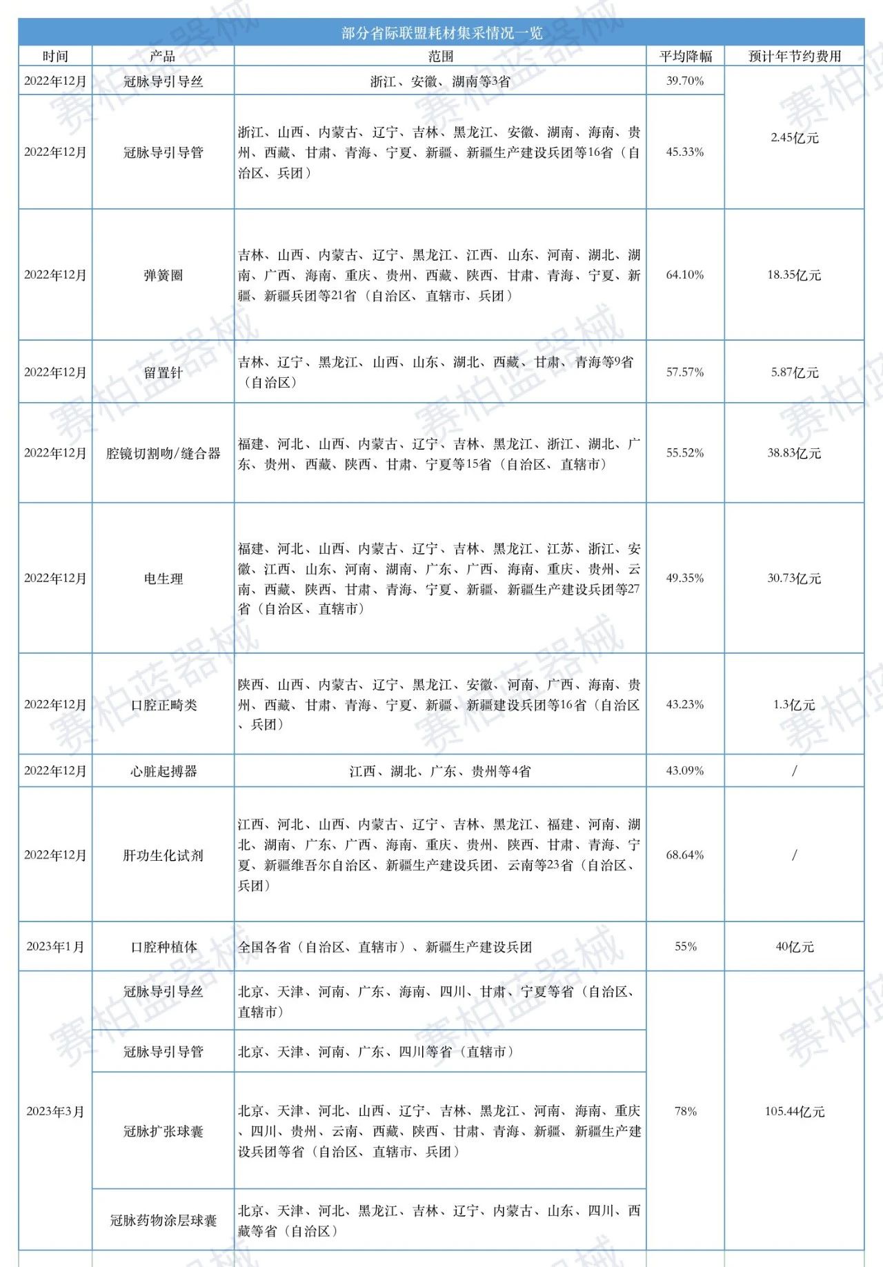 據賽柏藍器械梳理,近半年來開展的主要省際聯盟集采涉及冠脈導引導絲、冠脈導引導管、冠脈擴張球囊、口腔正畸類、電生理、腔鏡切割吻/縫合器、留置針、彈簧圈等諸多耗材,各聯盟年總節約費用預計超200億元。