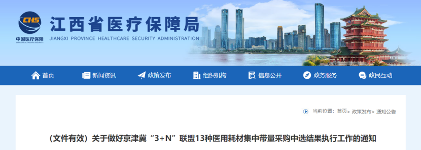 7月1日,江西醫保局發布《關于做好京津冀“3+N”聯盟13種醫用耗材集中帶量采購中選結果執行工作的通知》及《關于做好京津冀“3+N”聯盟骨科創傷類醫用耗材集中帶量采購中選結果執行工作的通知》。