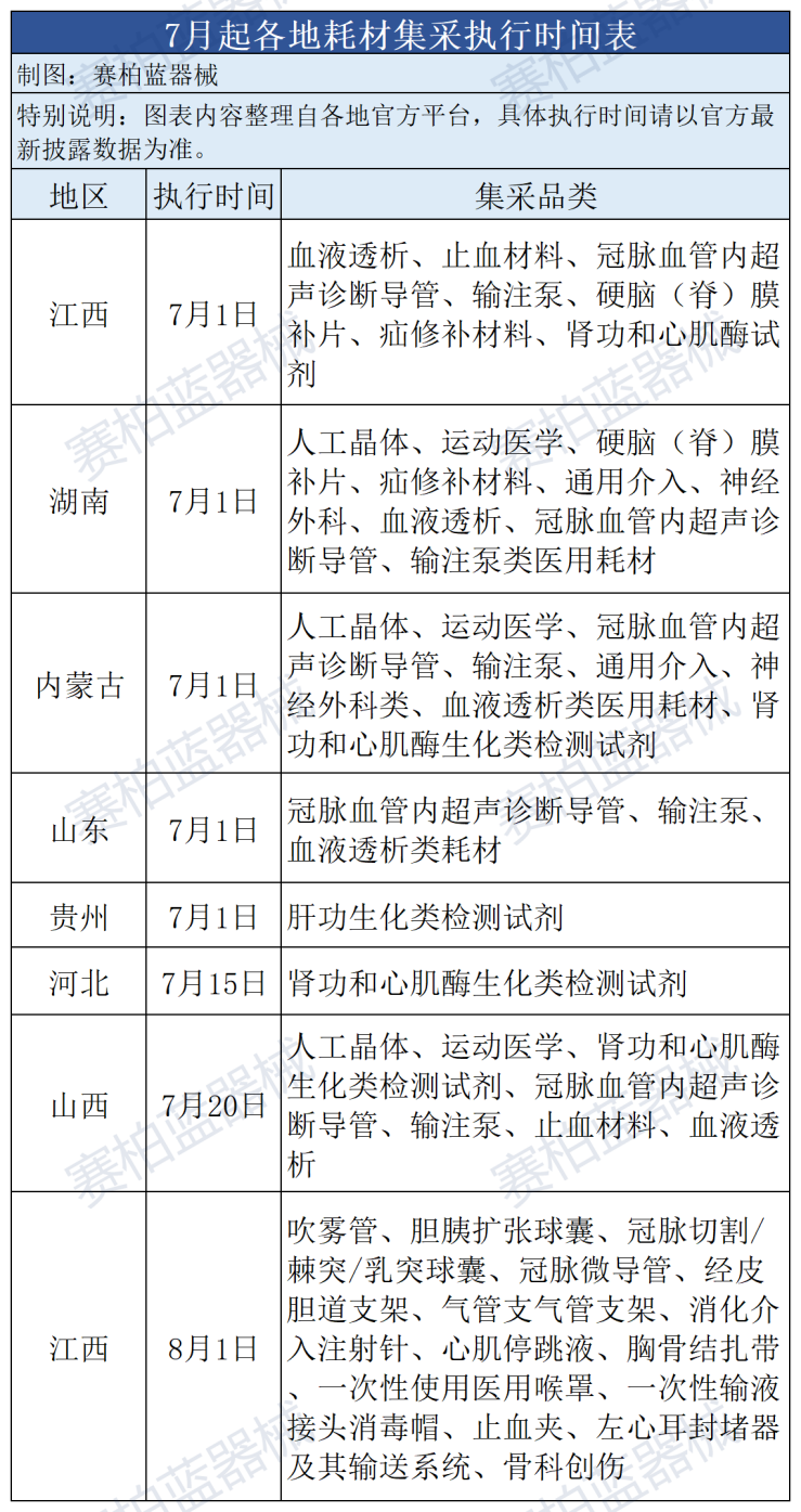 據賽柏藍器械梳理,7月起,江西、湖南、內蒙古、山西、河北、貴州、山東等地將陸續執行多類耗材集采結果,耗材降價鏈條持續震蕩。