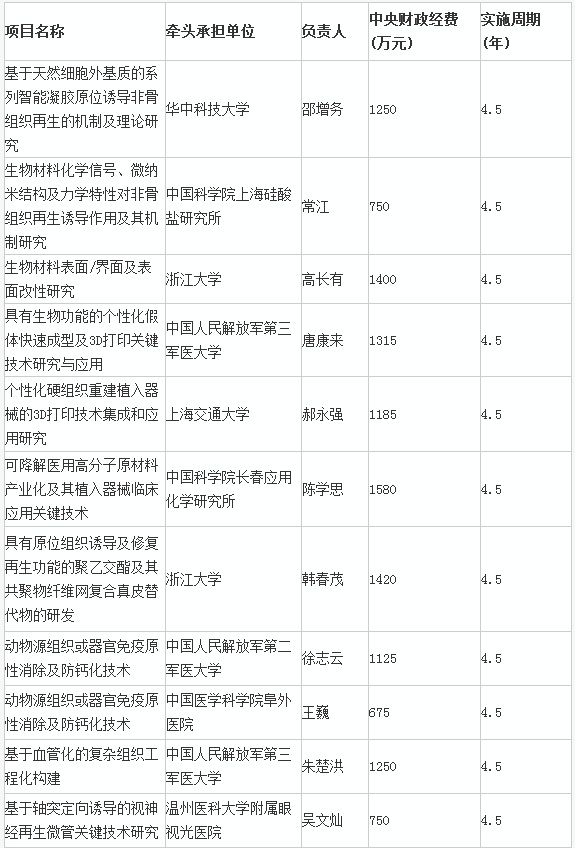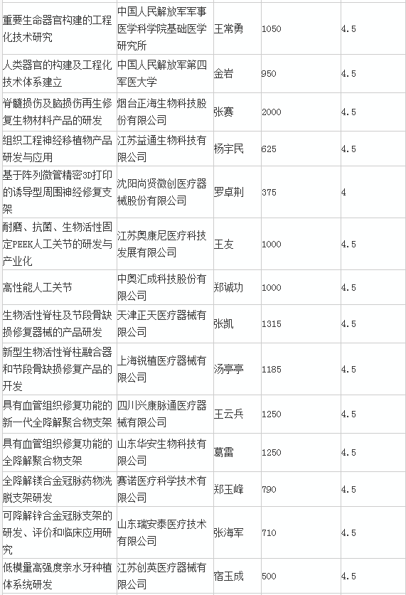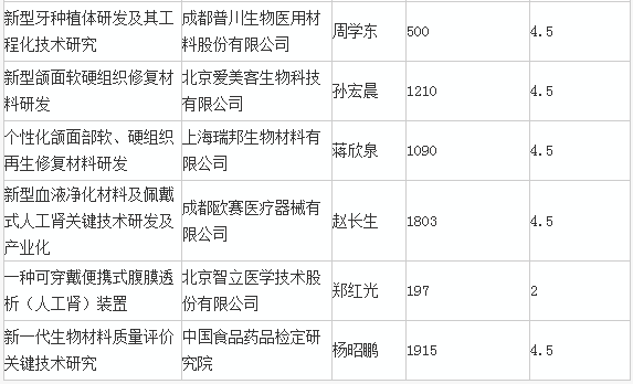 在31個“生物醫用材料研發與組織器官修復替代”項目中,有17個是由醫療器械公司來牽頭承擔的。