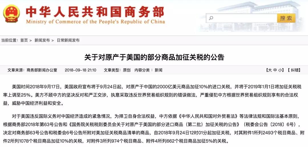 與此同時,商務部新聞發言人發表談話表示,為了維護自身正當權益和全球自由貿易秩序,中方將不得不同步進行反制。商務部公告稱,決定對商務部63號公告和稅委會6號公告所附對美加征關稅商品清單(中對美加征關稅第二批600億美元)的商品,自2018年9月24日12時01分起加征關稅。