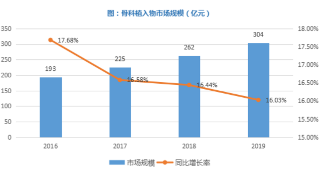 得益于我國龐大的人口基數、社會老齡化進程加速和醫療需求不斷上漲,加之進口替代的大背景,骨科行業持續高度景氣。據Eshare醫械匯測算,2019年骨科植入市場規模約為304億元,增長率為16.03%。