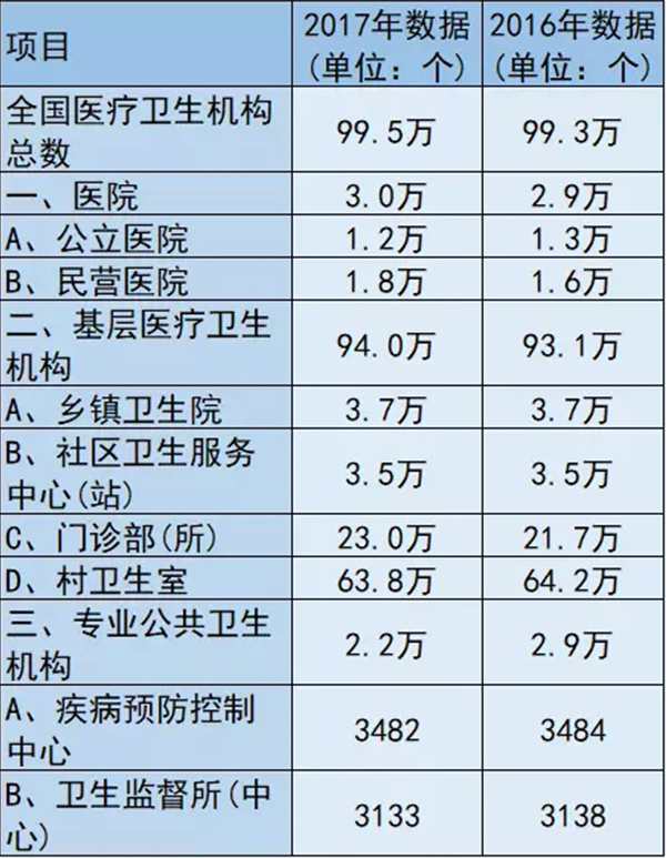 與之相對,在2017年內,全國公立醫院的數量比2016年又少了0.1萬個,村衛生室少了0.4萬個。
