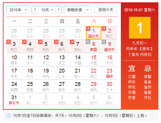2016年北京華康普美科技有限公司,“國慶節”假期為:10月1日(星期六)至10月7日(星期五)共放假7天,10月8日(星期六)至10月9日(星期日)正常上班。