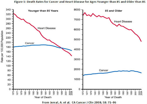癌癥治療的支出是巨大的。2013年全球抗癌藥的銷售額為850億美元,多數藥物以超過10萬美元的價格在市場上銷售。然而,平均而言,只有四分之一的患者對任何特定的治療有響應,這是非常低的一個響應率,很少有患者得到實際的治療。自尼克松總統對癌癥宣戰以來,狂熱的癌癥治療研究占了主導地位。但是,結果是令人沮喪的,如圖1所示,85歲以下的癌癥患者的死亡率只比1975年降低了8%。比較而言,心臟病的死亡率下降了高達60%左右,下降幅度是癌癥死亡率很多倍。