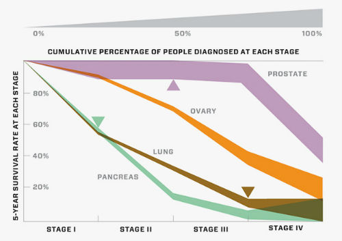 從圖2可以看出,許多癌癥的存活率是相似的,秘訣就是在癌癥的早期診斷出來。早期發現的話,大多數接受低風險手術的患者的生存率接近90%;但是在癌癥晚期發現的話(III期或IV期),治療方案只能選擇毒副作用極強的放療、化療等,存活率會隨之急劇下降。現在看來,第一段中提出的問題答案已經很明顯了。戰爭癌癥真正的途徑是做好早期檢測,選擇針對癌癥激活途徑的靶向性治療方案。