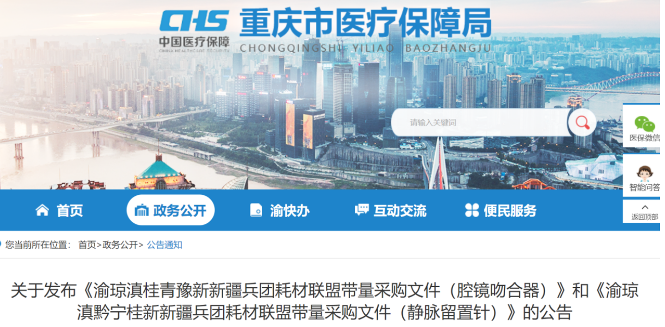 10月22日,重慶市醫保局發布《渝瓊滇桂青豫新新疆兵團耗材聯盟帶量采購文件(腔鏡吻合器)》,重慶、海南、云南、廣西、青海、河南、新疆、新疆生產建設兵團(自治區、直轄市)聯盟帶量采購正式啟動,集采產品為一次性腔鏡用直線型切割吻合器及組件(含電動吻合器及組件)。