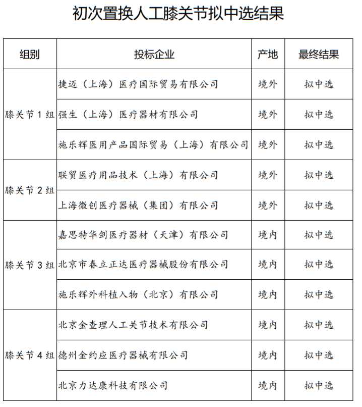 初次置換人工膝關節擬中選結果涉及強生、捷邁、施樂輝、上海微創等11家械企,在此之前,共24家械企符合申報條件;