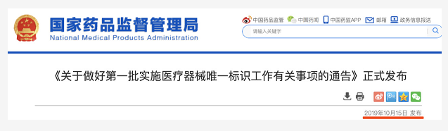 今日下午(10月15日),國家藥監局官網發布通知,《關于做好第一批實施醫療器械唯一標識工作有關事項的通告》正式發布。