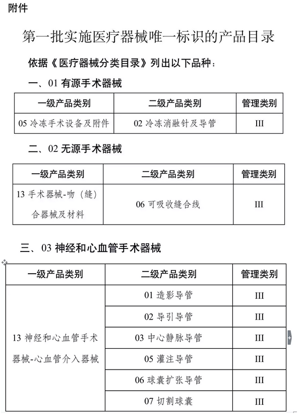 此前,國家藥監局發布了該要求的征求意見稿,經修訂后,確定后的《通告》對第一批醫療器械唯一標識實施品種范圍、進度安排、工作要求等進行了明確規定。