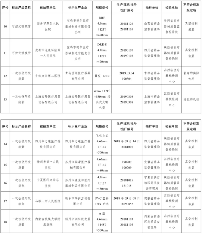 (五)呼吸道用吸引導(dǎo)管(吸痰管)11批次產(chǎn)品:寶雞市德爾醫(yī)療器械制造有限責(zé)任公司、青島世運(yùn)醫(yī)療器具有限公司、上海宏隆醫(yī)療用品設(shè)備有限公司、四川華力康醫(yī)療科技有限公司、蘇州市華豪醫(yī)療器械有限公司、蘇州市麥克林醫(yī)療器械制品有限公司、新鄉(xiāng)市華西衛(wèi)材有限公司、揚(yáng)州宇潤(rùn)科技發(fā)展有限公司、億信醫(yī)療器械股份有限公司生產(chǎn),涉及真空控制裝置、管身的實(shí)際長(zhǎng)度、端孔的孔徑不符合標(biāo)準(zhǔn)規(guī)定。