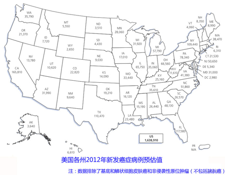 圖1:美國各州2012年新發(fā)癌癥病例預(yù)估值
