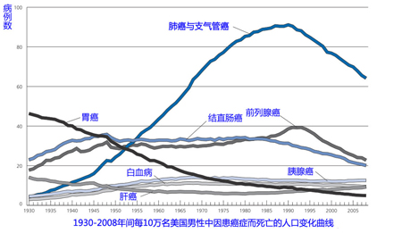 圖2:1930-2008年間每10萬名美國男性因患癌而死亡的人口變化曲線