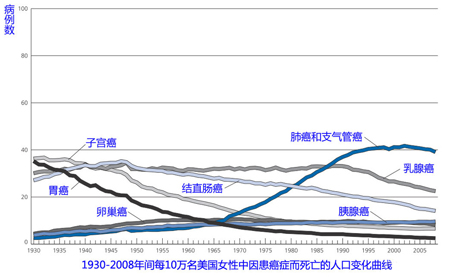 圖3:1930-2008年間每10萬名美國女性因患癌而死亡的人口變化曲線