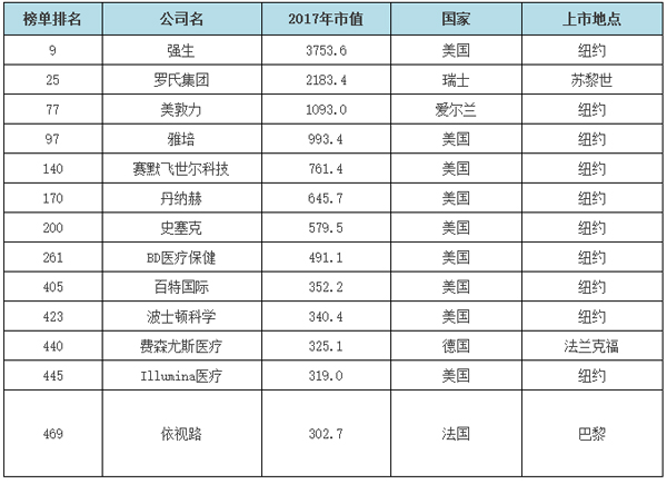 500強(qiáng)中,涉及到醫(yī)療器械的企業(yè)共有13家,其中美國企業(yè)居多,共有9家,其余的有來自瑞士、愛爾蘭、德國和法國。