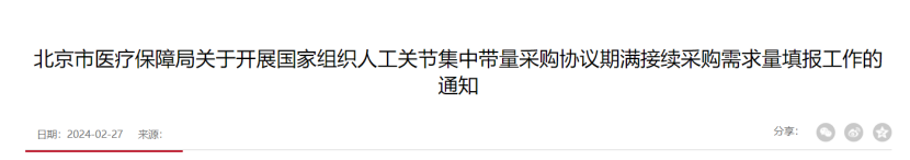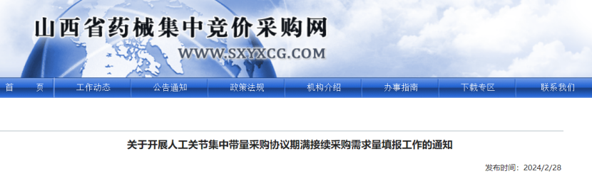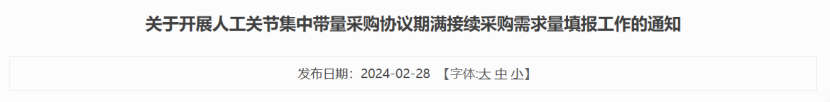 今日(2月28日),上海、山西、內蒙古等多地發布《關于開展人工關節集中帶量采購協議期滿接續采購需求量填報工作的通知》。
