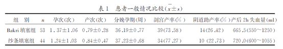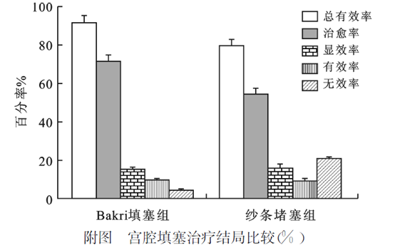 宮腔紗條填塞35例患者止血成功,術(shù)后24~38h內(nèi)宮腔紗條取出順利。其中9例止血失敗患者中,1例B超提示疑為因胎盤植入行全子宮切除,1例行子宮動脈結(jié)扎,7例延長填塞時間、聯(lián)合子宮體或肌注欣母沛250μg、補(bǔ)充凝血因子后達(dá)到止血效果。術(shù)后2d 體溫超過38.5℃6例,其中38.0~39.3℃2例,繼續(xù)抗感染治療后體溫回復(fù)正常,3~5d后痊愈。可見,Bakri填塞術(shù)顯著優(yōu)于紗條填塞組(P<0.05) ,見表2附圖。