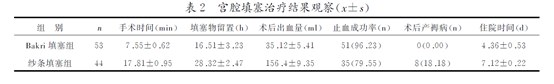2.2紗條填塞:填塞紗條由本院自制,規(guī)格為200cm×8cm,厚6層,經(jīng)高溫高壓滅菌并于0.2%甲硝唑溶液中浸透擠干后備用。