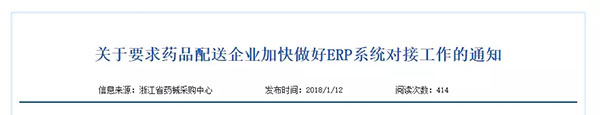 1月2日,浙江省藥械采購平臺發布《關于要求藥品配送企業加快做好ERP系統對接工作的通知》(以下簡稱《通知》)。