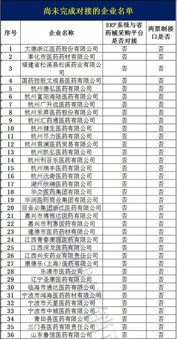 現將截止至2018年1月11日尚未完成對接的配送企業進行公布(詳見附件),請相關配送企業按文件要求于2018年3月底前完成相關系統對接工作,具體事宜請咨詢浙江省藥械采購中心信息技術科。