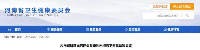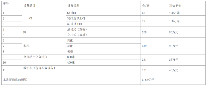 11月16日,河南衛健委發布《河南省縣域醫共體設備更新采購需求調查征集公告》,向全國開展需求調查。本次采購意向預算5.83億元,采購設備包括CT、DR、彩超、全自動生化分析儀、救護車(包含車載設備)。
