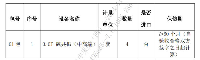 項目四預算總金額1.02億元。其中,擬采購3.0T 磁共振(中高端)4套,最高限價6000.00萬元;擬采購3.0T 磁共振(中端)1套,最高限價1200.00萬元;擬采購1.5T 磁共振2套,最高限價1200.00萬元;擬采購64排及以上CT 6套,最高限價1800.00萬元。同樣不允許進口。