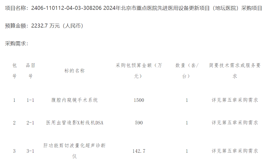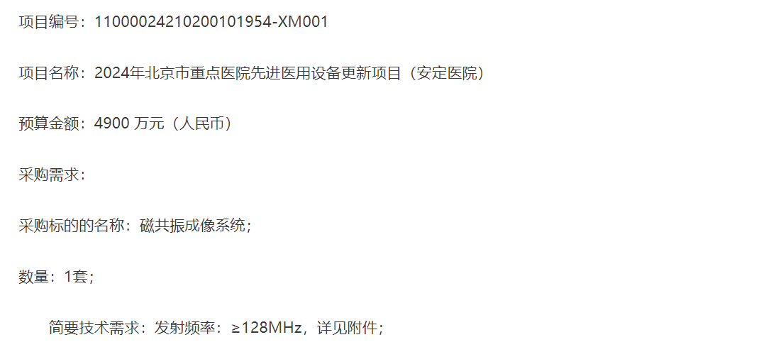 此外,2024年北京市重點醫院先進醫用設備更新項目開始招標。目前安定醫院、地壇醫院相關采購已發布招標公告,涉及品類包括腹腔內窺鏡手術系統、醫用血管造影X射線機DSA、磁共振成像系統等。