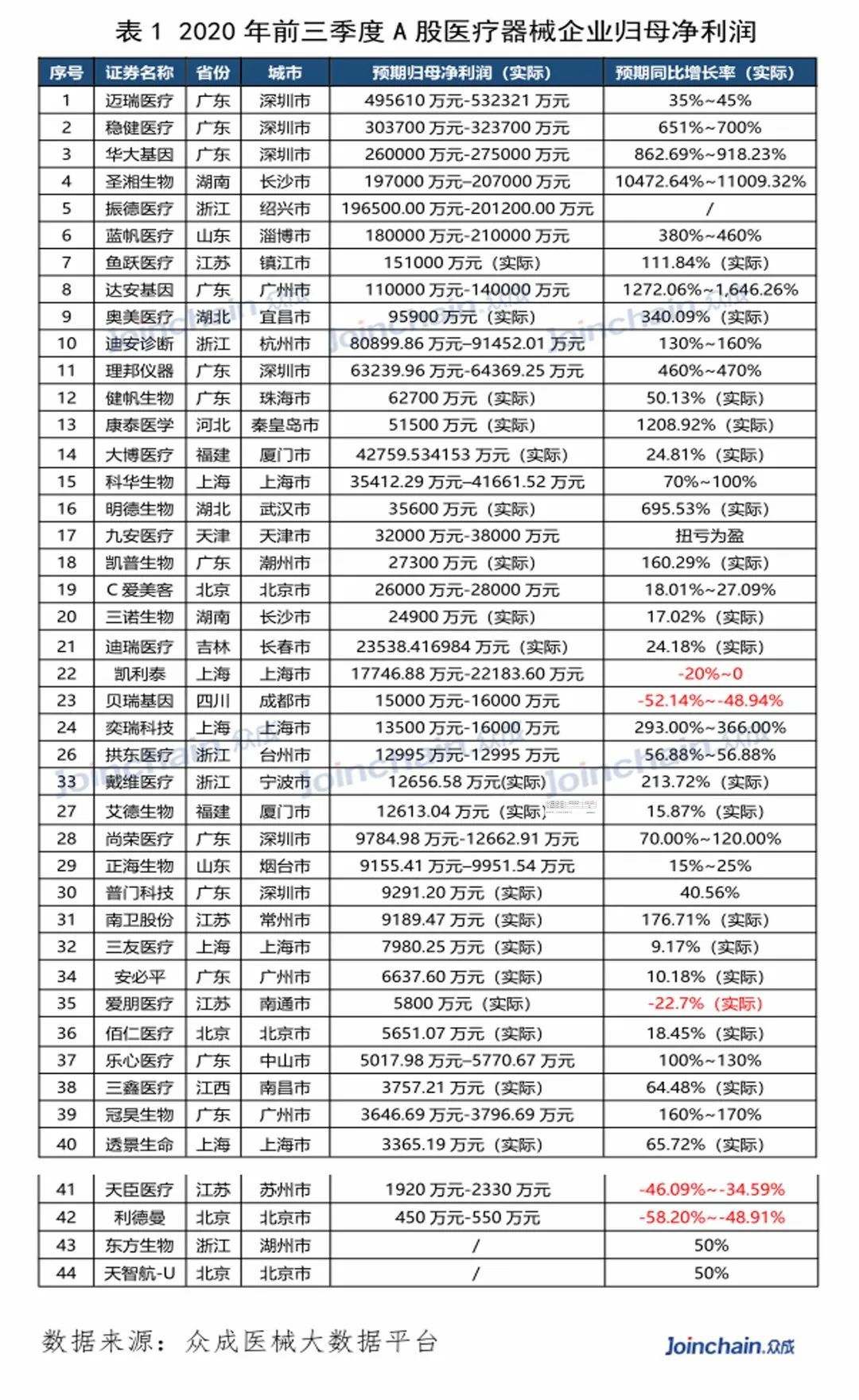 2020 年前三個季度,新冠疫情在全球范圍的爆發(fā),使醫(yī)療器械成為急需補給的產(chǎn)品,2020年國內(nèi)A股上市械企業(yè)績整體上漲。截至10月26日,國內(nèi)A股有共有44家械企公布前三季度業(yè)績已經(jīng)預(yù)告。