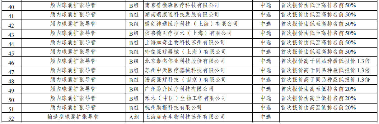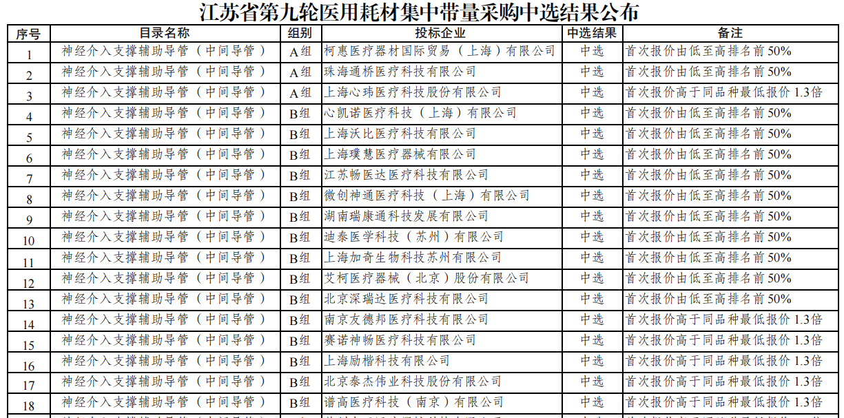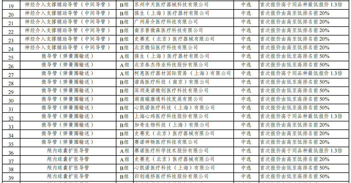 《公告》中公布了神經介入支撐輔助導管(中間導管)、微導管(彈簧圈輸送)、顱內球囊擴張導管(含輸送型顱內球囊擴張導管)這三類耗材的集采中選結果。具體如下: