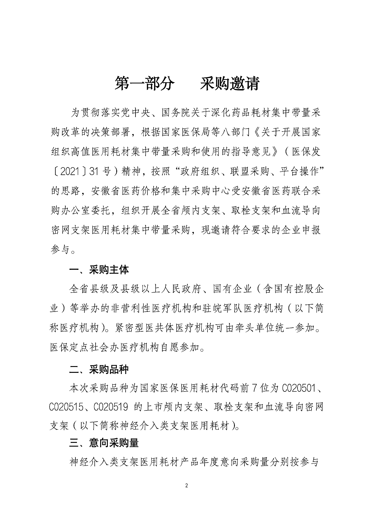 《征求意見稿》顯示,安徽省醫藥價格和集中采購中心受安徽省醫藥聯合采購辦公室委托,組織開展全省顱內支架、取栓支架和血流導向密網支架醫用耗材集中帶量采購,采購周期為2年。